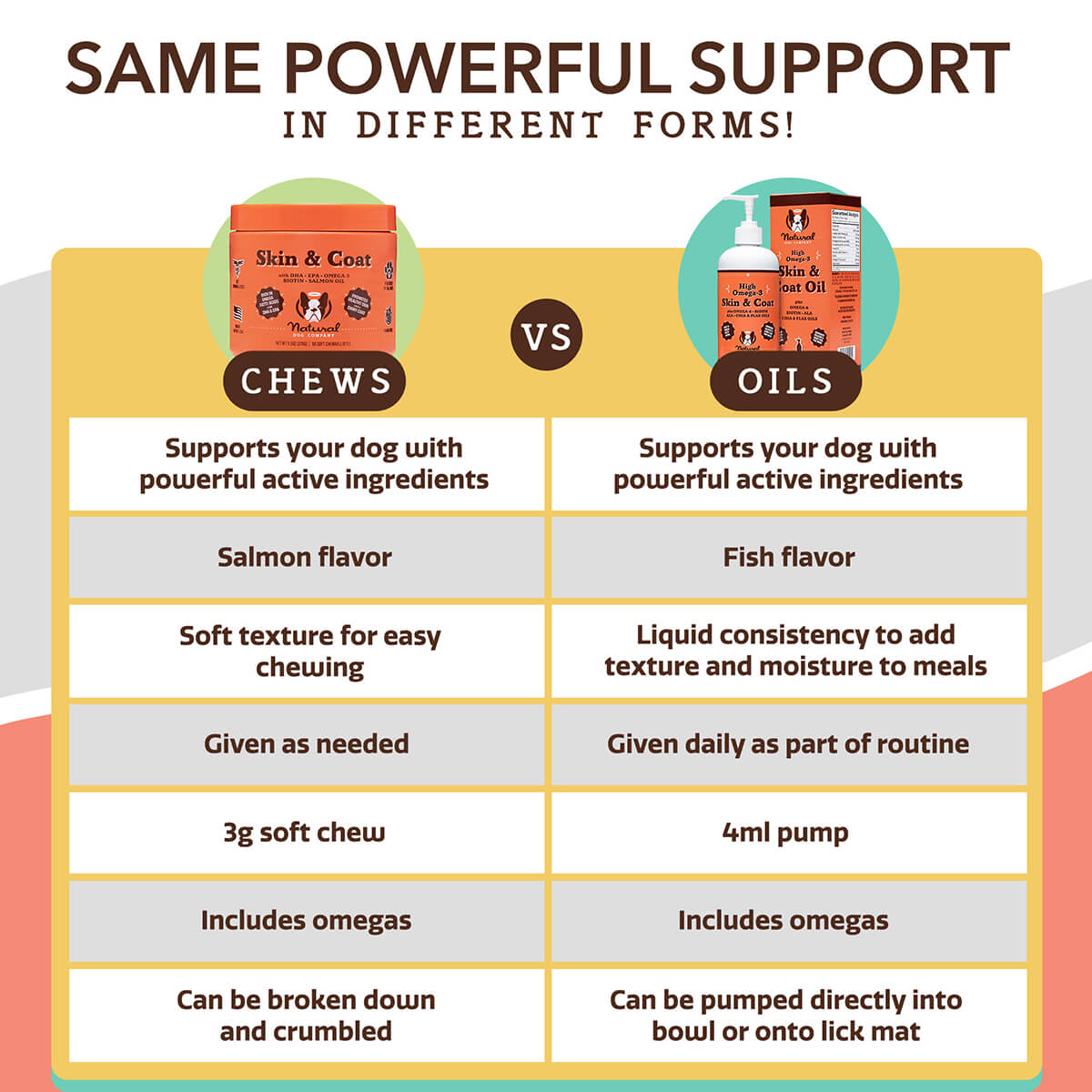 - Alleviating Allergies & Itching - Skin & Coat Chews are rich with Omega-3s that help support healthy skin by moisturizing and nourishing it from within — alleviating dryness, flakiness, and allergy-related issues.